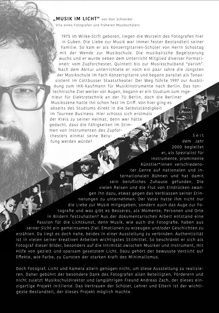 Der gebürtige Gubener Dan Schneider war in den 90er Jahren selbst Schüler der Musikschule und kehrt nach einem guten Vierteljahrhundert zurück. Etwa ein Jahr liegt zwischen der Idee, den ersten Probefotos, dem dreitägigen und intensiven Fotoshooting, dem aufwendigen Aufbereiten der Bilder und dem Druck.